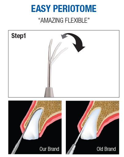 EASY PERIOTOME adopts the flexible type which can be bent freely, and ensures approach to the tooth root, so that you can cut off the periodontal ligament very easily.