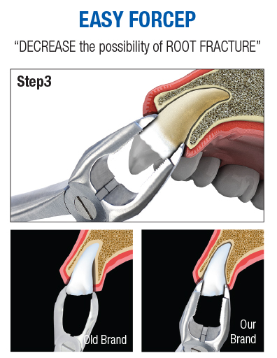 EASY FORCEP delivers force by grasping more apical portion than previous instruments, decreasing the possibility of root fracture significantly during extraction.